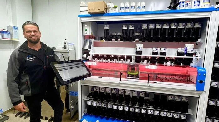 Manuel Arlt mit dem neuen automatisierten Farbmischsystem. © Sabine Holroyd