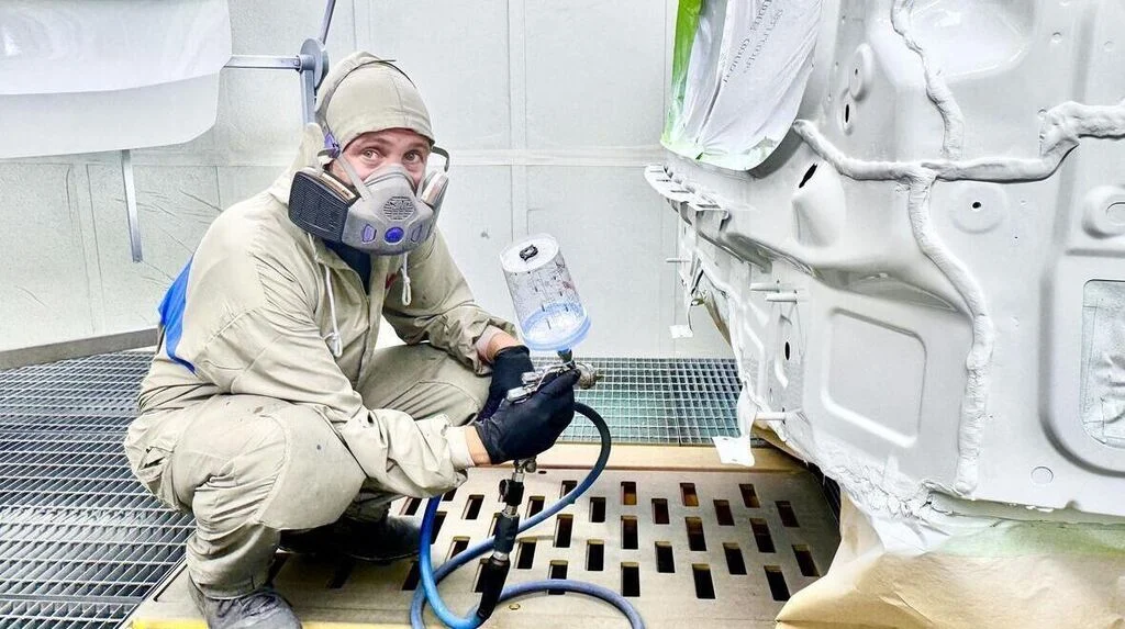 Ein Mitarbeiter trägt die Farbe auf die Karosserie – schneeweiß ist der Lack. © Sabine Holroyd