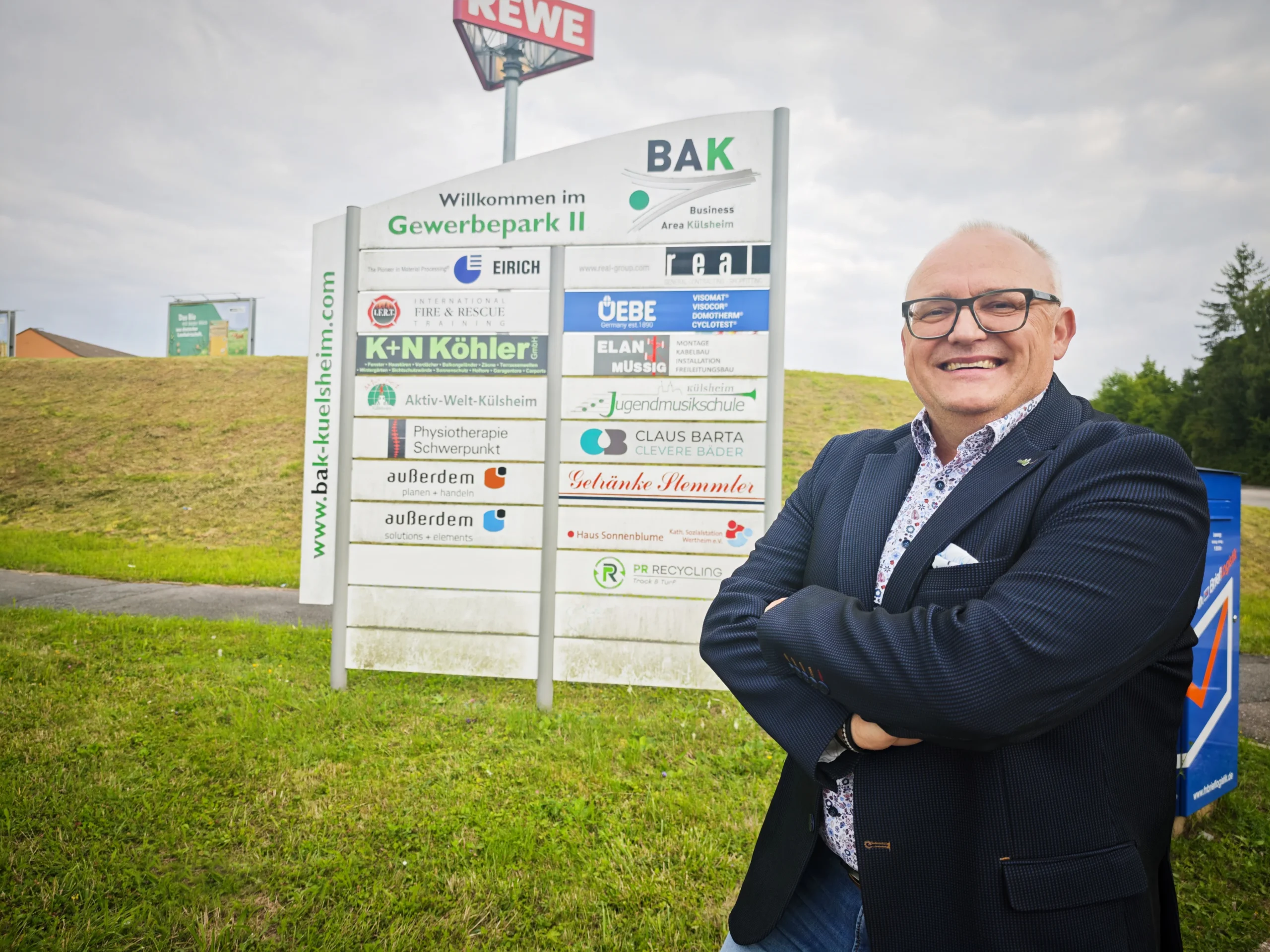 Külsheims Bürgermeister Thomas Schreglmann steht am Eingang zum neu entstandenen Gewerbepark. Das Stadtoberhaupt zieht eine durchweg positive Bilanz beim Thema Konversion. Bild: Heike Barowski